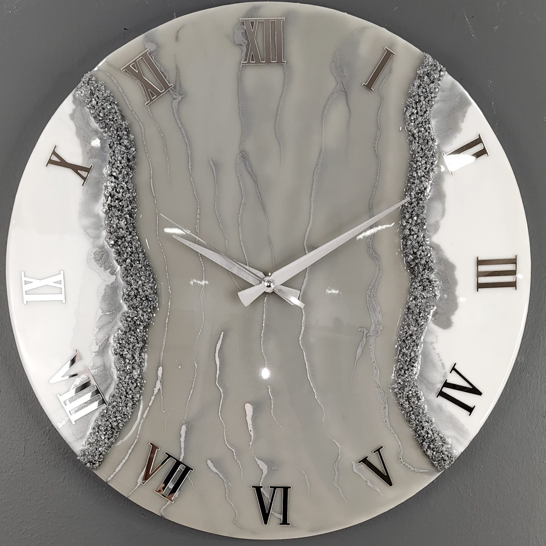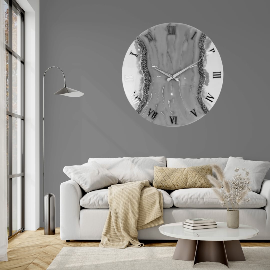 Epoksi Yuvarlak Saat 50 cm (Beyaz-Siya-Gümüş)